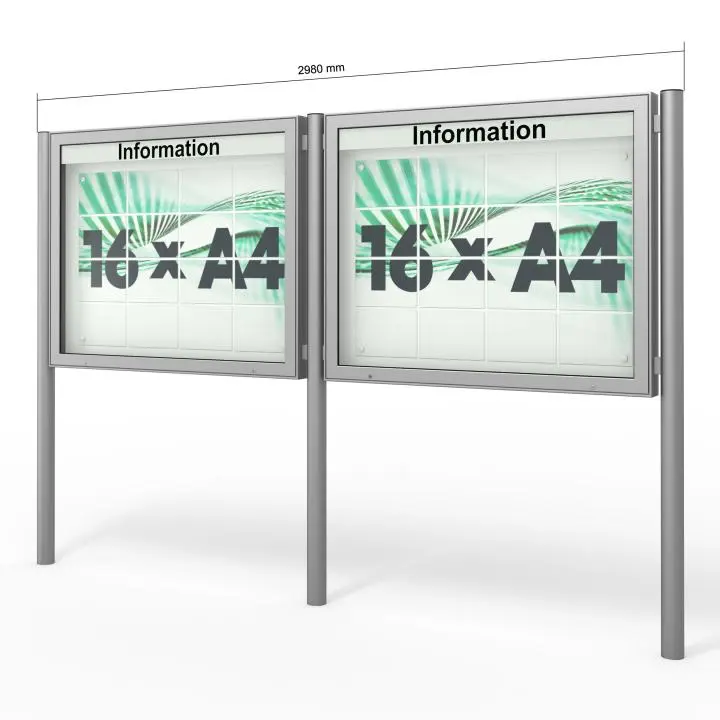 Merkmale Schaukasten: Klappflügel, LED-Beleuchtung, abschliessbar, magnetisch, mit Pfosten, mit Standbeinen, wetterfest